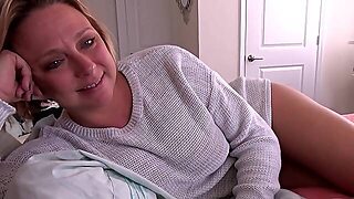 Stepmom surprised by surprise jizz! Stepson finds blindfolded stepmom for a wild ride on the couch
