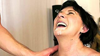 Skinny blonde mature granny gets cum in mouth after a doggy fuck