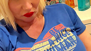 Curvy housewife with large natural breasts cleans the bathroom in sexy nylons for home camera