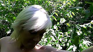Busty French woman with glasses is sucking her lover's dick in the garden, before getting fucked