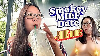 Outdoor Public Smoking Asian MILF Date: Smoking Sipping Coffee + Bonus Jiggling Boobs